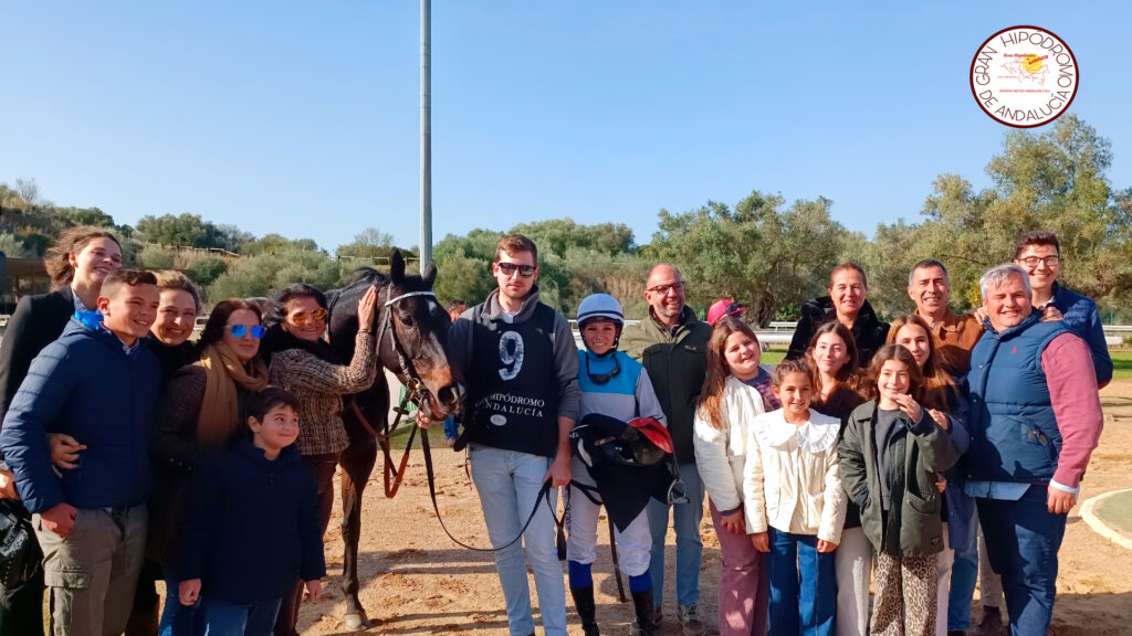 La jockey Denisa Sikorova, tras ganar la tercera carrera de la jornada junto al participante SAVE YOUR BREATH (IRE) y miembros de la cuadra MANUELA | Juanjo Mariscal – Comunicación y RR.SS. GHA